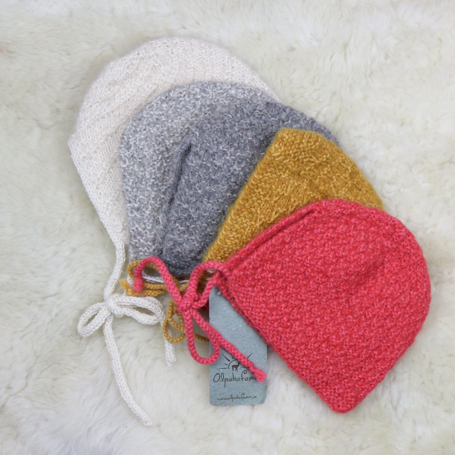 Siltas un mīkstas cepurītes mazuļiem, ko adījusi alpaku fermas meita Deizija.